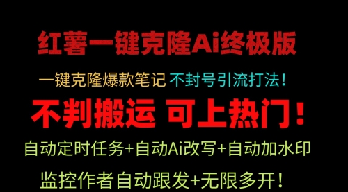 小红薯一键克隆Ai终极版!独家自热流爆款引流,可矩阵不封号玩法!